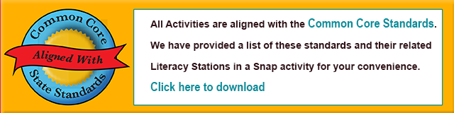 Literacy Stations in a Snap! Full Kit 37 Activities which address the major reading components of phonemic awareness, phonics, vocabulary, comprehension and fluency. (See individual components below for specifications) This set is available on full color 12pt. UV coated stock from www.schoolaids.com. Individual activities are available for download in their corresponding sections below. $124.99![]() |