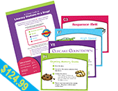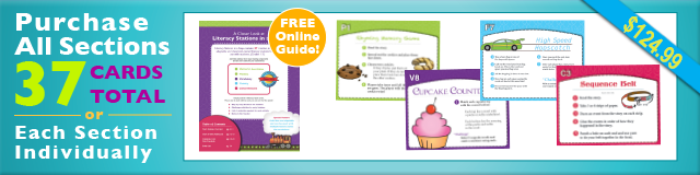 Comprehension Activities cover skills such as recalling facts and details, sequencing story events, identifying the main idea, recognizing story elements, summarizing highlights, comparing and contrasting characters and story facts. Kit includes 11 colorful, color-coded activity cards with 36 game pieces and graphic organizers. This set is available on full color 12pt. UV coated stock from www.schoolaids.com. Individual activities are available for download here. $29.95